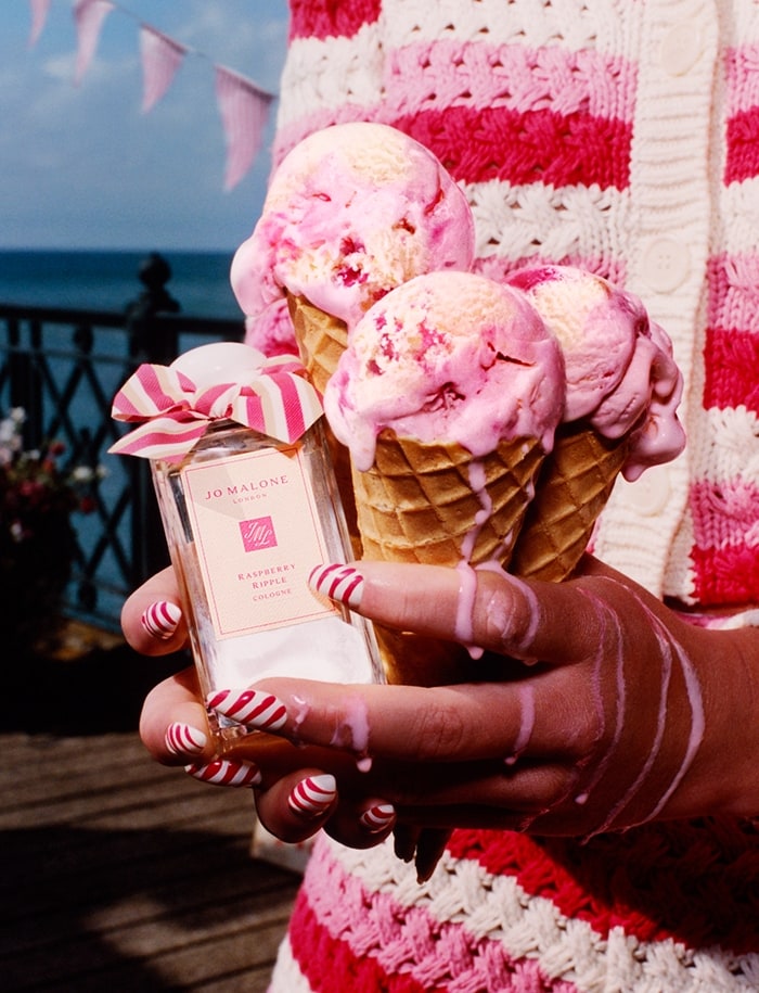الآيس كريم الذي لا يُضاهى: رازبيري ريبل. آيس كريم الفانيليا الكلاسيكي الشهي الكريمي الناعم الذي تتخلله موجات من توت العليق الشهي. يُعد هذا الآيس كريم من أساسيات الصيف في بريطانيا؛ إذ يعيد إلينا أحلى الذكريات، وهو مصدر الإلهام لاسم عطر Raspberry Ripple الجديد من Jo Malone London.